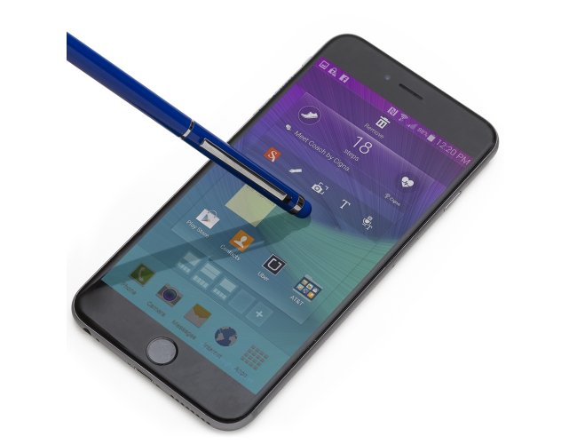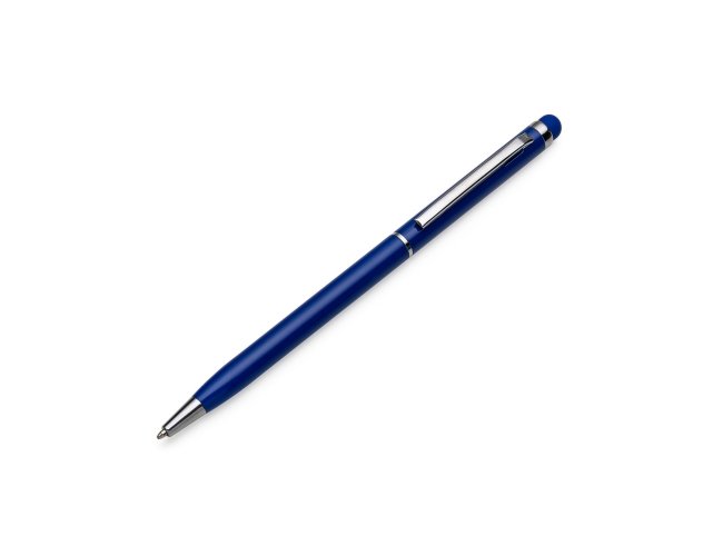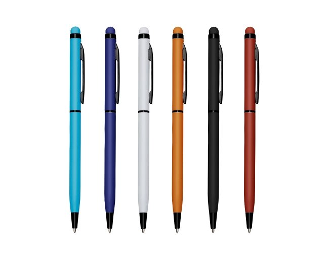 Caneta metal fina com ponteira touch. Corpo colorido com clip e anel central prata, possui borracha touch na cor da caneta. Aciona por giro.