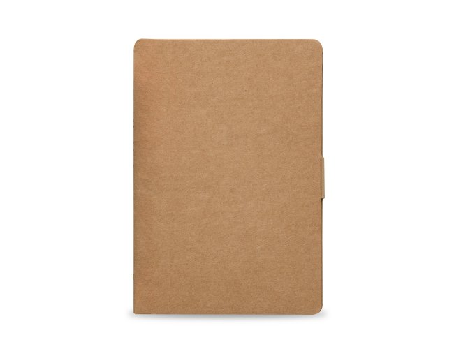 Bloco de anotações ecológico, material em kraft. Possui uma trava na própria capa, caneta de papelão com acabamentos em plástico acionada por clique, cinco blocos auto colantes coloridos, bloco de post-it amarelo e bloco com aproximadamente 70 folhas.