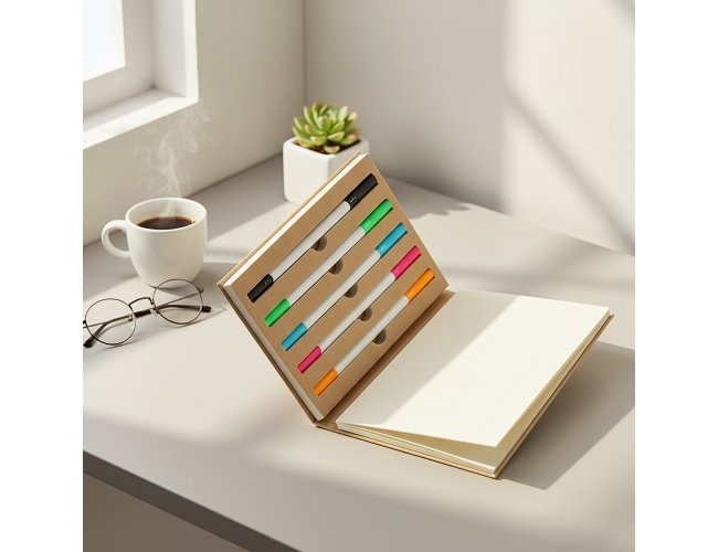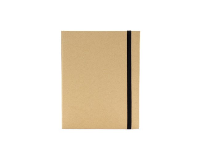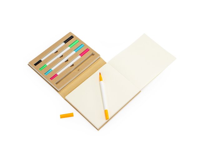 Bloco de anotações com capa dura em kraft e fechamento por elástico. Possui aproximadamente 80 folhas de tonalidade marfim sem pautas e cinco canetas coloridas de ponta dupla: uma fina e outra tipo pincel.