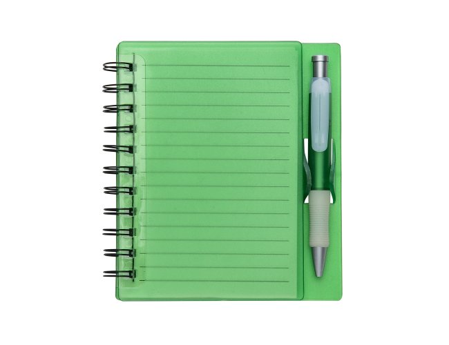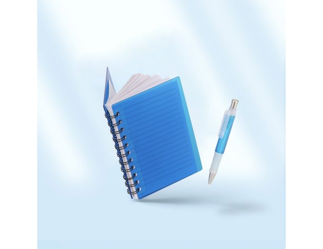 Caderneta plástica wire-o com caneta e suporte para encaixe. Caneta plástica com detalhe emborrachado, carga esferográfica na cor azul e acionamento por clique.