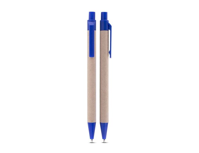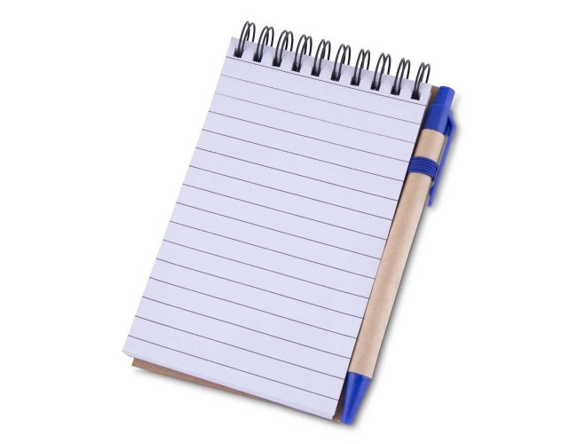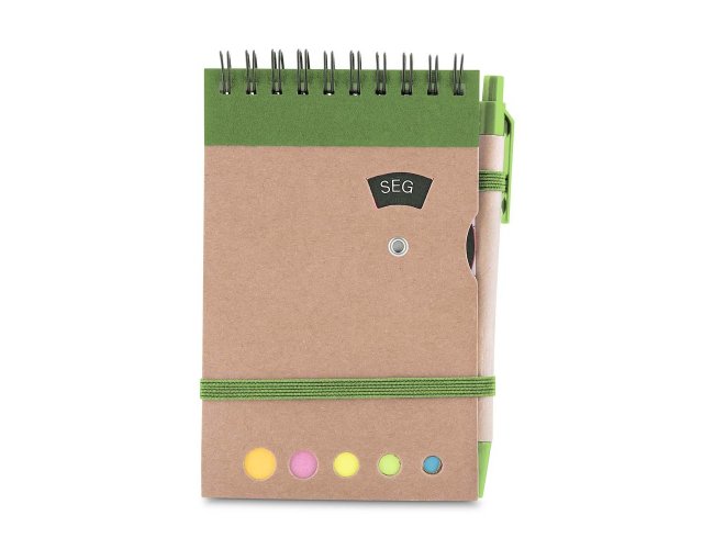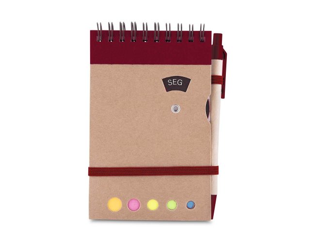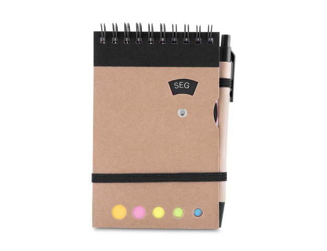 Bloco de anotações com capa em kraft, encadernação Wire-O, porta-caneta e fechamento em elástico, além de disco rotativo com os dias da semana. Inclui cerca de 70 folhas pautadas e cinco blocos de marcadores coloridos autocolantes, com 26 unidades cada. Acompanha caneta esferográfica azul de 1,0 mm, com corpo em papelão, acionamento por clique e detalhes em plástico.