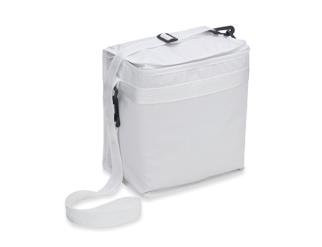Bolsa térmica de bagum sintético com capacidade de 10 litros, contém revestimento interno em polietileno atóxico soldado (não vaza), bolso sintético externo de matelassê e alça tiracolo ajustável de polipropileno.