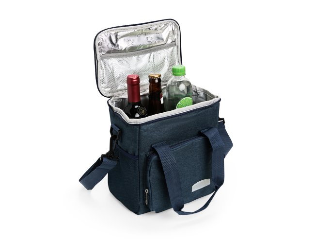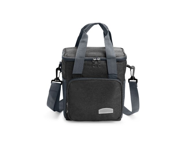 Bolsa térmica em Oxford resistente à água, com capacidade de até 7 litros e fechamento em zíper. Possui revestimento térmico em folha de alumínio na tampa e em PEVA no restante do interior, contribuindo para conservar a temperatura de alimentos e bebidas por mais tempo. Apresenta bolso frontal externo com zíper e dois bolsos laterais em tela de nylon com elástico. Dispõe ainda de duas alças laterais fixas e uma alça transversal removível.