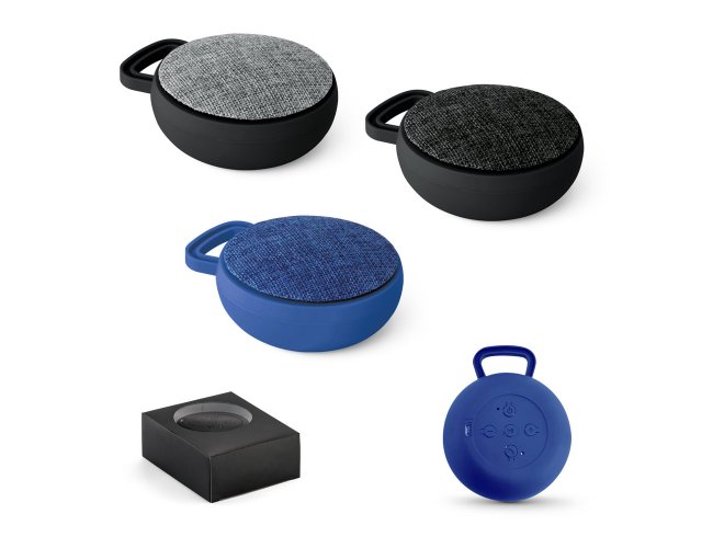 Caixa de som com microfone. ABS e tecido em poliéster. Com gancho e acabamento emborrachado. Transmissão por bluetooth. Com 3W/4Ω. Autonomia até 3 h. Função para atender chamadas, controle de volume e conexão à playlist do dispositivo móvel. Incluso cabo para carregamento. Fornecida em caixa presente. ø90 x 40 mm | Caixa: 115 x 95 x 45 mm