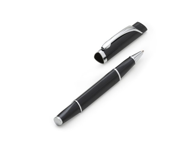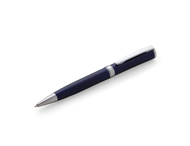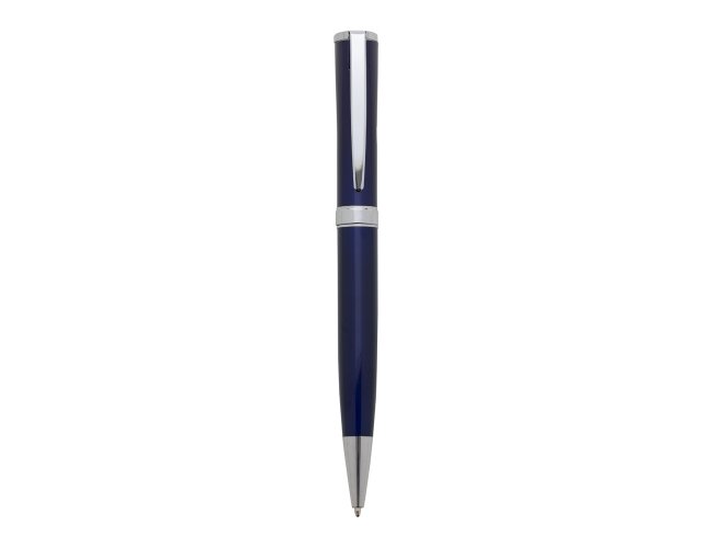 Caneta metálica com carga esferográfica azul 1.0 mm e acionamento por rotação.