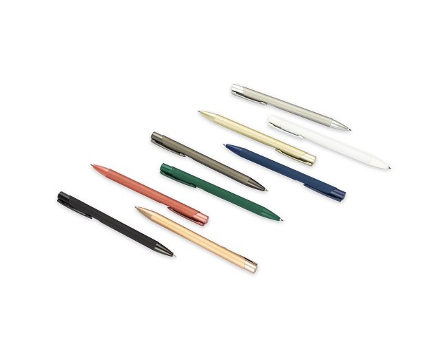Caneta metálica com ponta e clip em plástico. Possui acionamento por clique e carga esferográfica azul de 1.0mm.