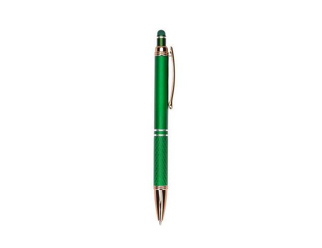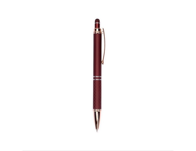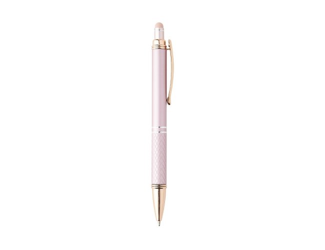 Caneta metálica touchscreen com parte inferior texturizada, acionamento por clique e carga esferográfica azul 1.0mm.