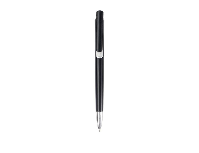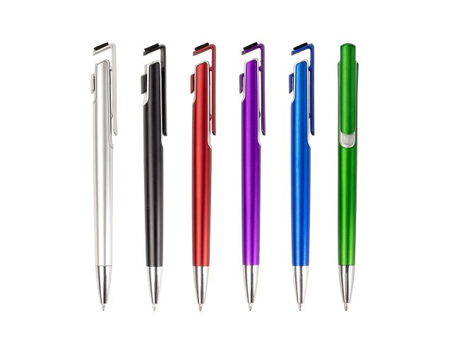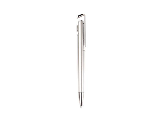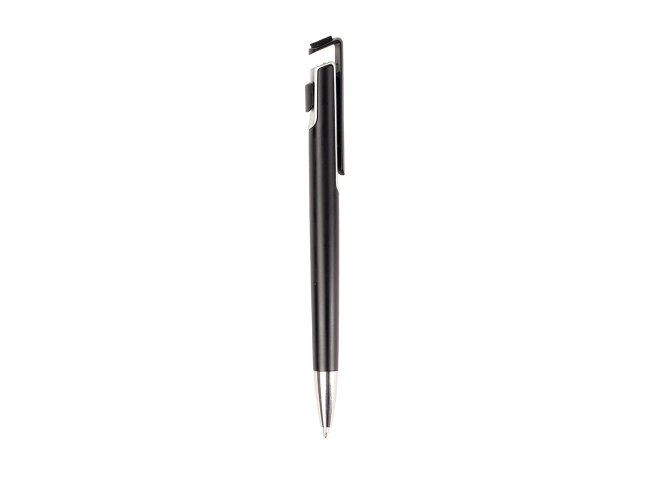 Caneta plástica com ponta metálica, acionamento por clique e abertura que funciona como suporte de celular.