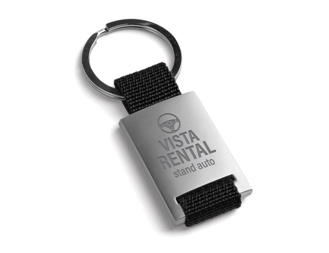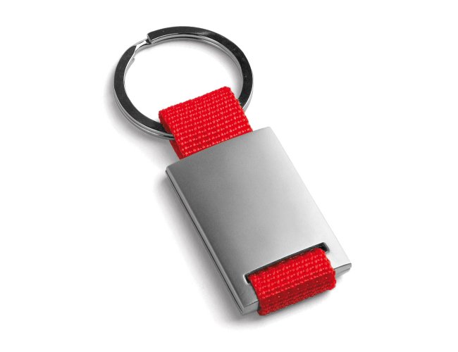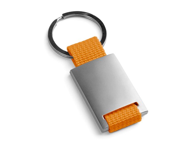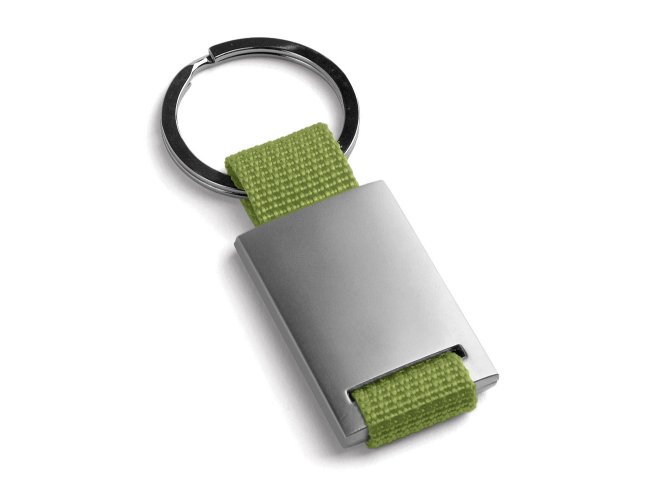Chaveiro em metal e em webbing. Fornecido em caixa presente de papel kraft reciclado. 28 x 60 x 6 mm
