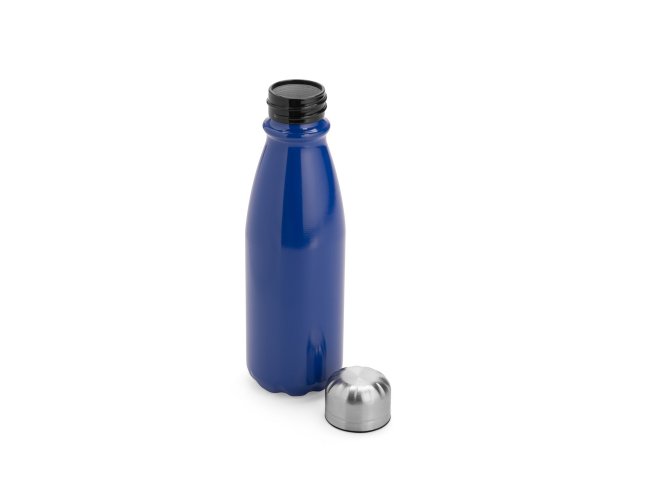 Garrafa em alumínio com tampa rosqueável e capacidade para até 550ml.