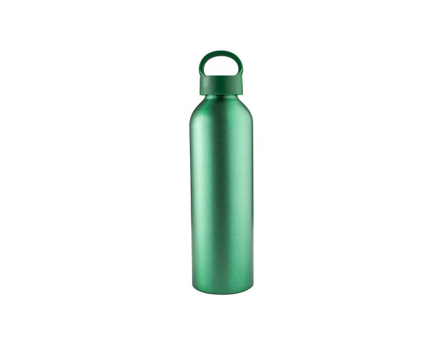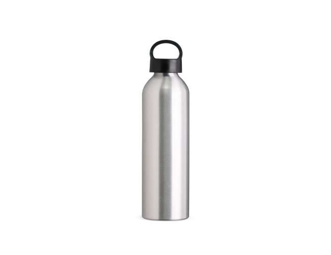 Garrafa de alumínio 630ml. Possui tampa plástica rosqueável com alça integrada.