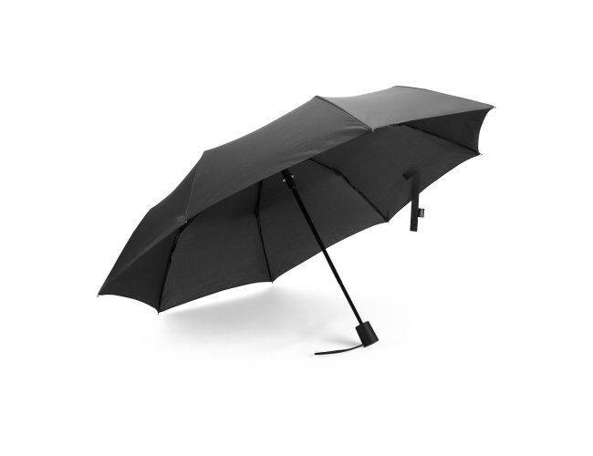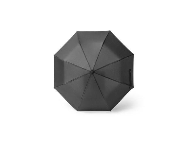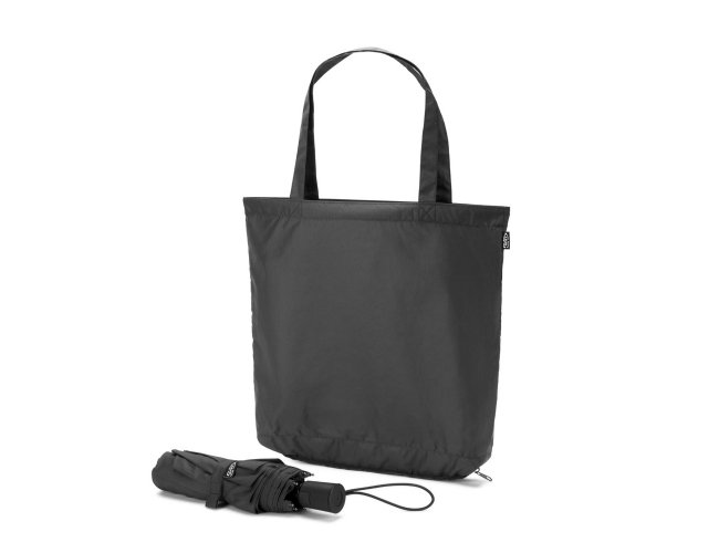 Guarda-chuva 2 em 1 com sacola de compras em poliéster reciclado incluso. Guarda-chuva de 21'' em poliéster 100% reciclado pongee 190T, com pega em ABS 35% reciclado, varetas em fibra de vidro e haste metálica. O guarda-chuva dobrável em 3 seções, tem abertura automática e é à prova de vento. Sacola de compras em poliéster reciclado, onde pode ser guardado para transporte ou utilizado separadamente. Ø970 x 290 mm | Sacola: 420 x 390 mm