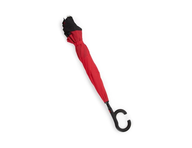 Guarda-chuva invertido com forro interno. Tecido ponge chinês e seda poliéster, possui um mecanismo inovador permitindo que o usuário não se molhe ao entrar e sair de ambientes devido sua abertura invertida, quando feito o movimento para fechar as varetas inverterão para cima criando um formato circular impedindo a chuva de atingir o usuário, podendo “segurar” a chuva enquanto entra/sai de um ambiente, ao virar o guarda-chuva a água irá escorrer. Forro interno para preservação das 8 varetas, evitando contato com a água e assim prolongando seu tempo de uso sem enferrujar. Ao impulsionar o fechamento invertido fica mais rápido e prático o modo de secar e ser guardado, pode ser apoiado no chão que permanecerá em pé para escorrer a água. Pegador plástico fosco em formato C, botão acionador vermelho e fita com velcro para lacre.