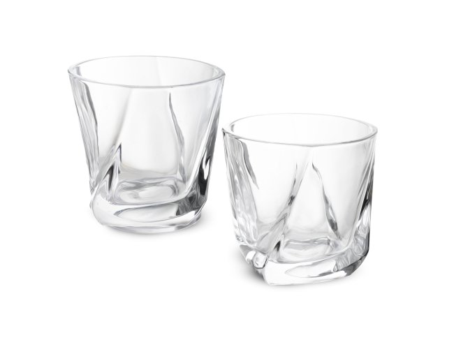 Kit drink contendo 2 copos de vidro (200ml cada), 1 pinça para gelo com pontas em silicone e 6 pedras de granito para gelo, acondicionado em caixa presenteável fabricada em papel cartonado resistente.