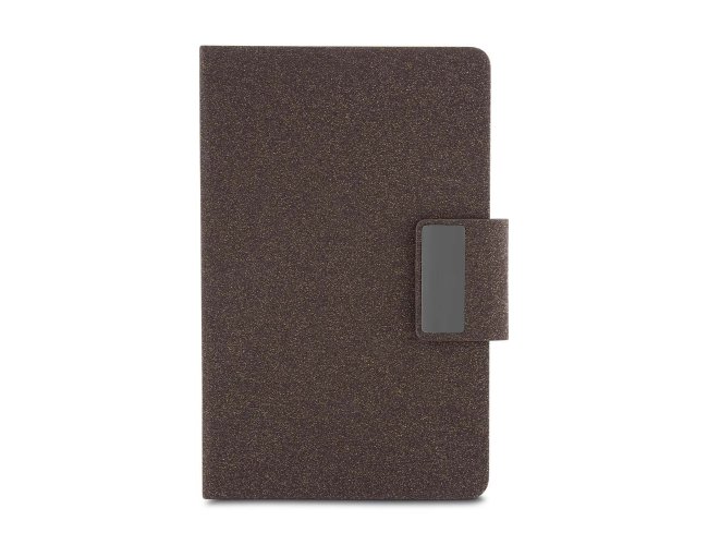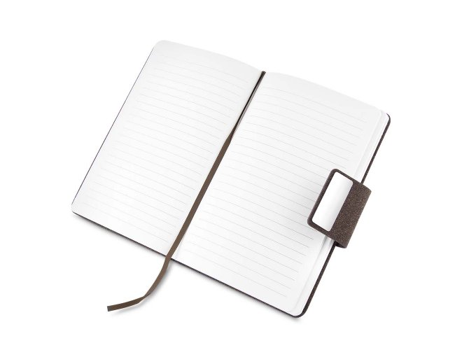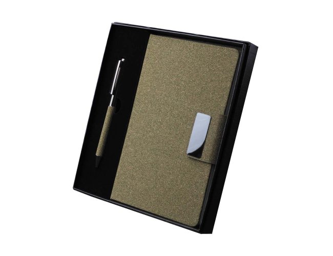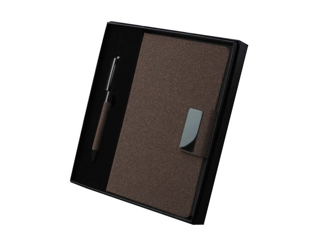 Kit de Escritório composto por caderno tamanho A5, com capa em PU e detalhe em fibra de chá ou café,