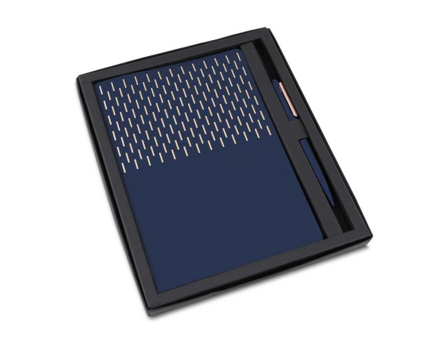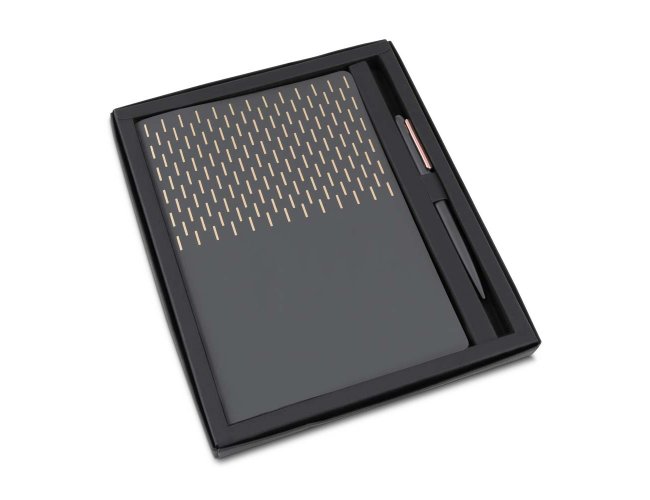 Conjunto composto por caderno com capa em PU com detalhe de gravação dourada,