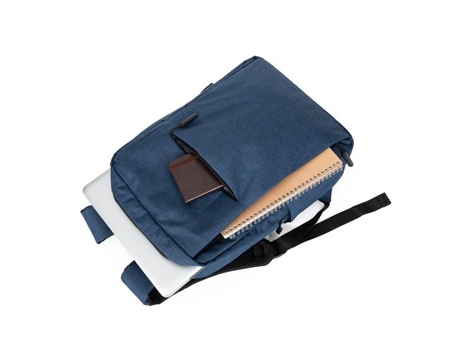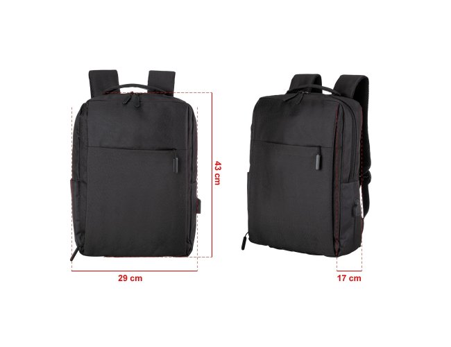 Descrição: Mochila confeccionada em nylon com compartimento para notebook até 15,6 polegadas. Contém compartimento grande com divisórias para documentos, eletrônicos e caneta, compartimento mediano com abertura vertical, compartimento frontal, bolsos laterais e adaptador USB externo com cabo acoplado, permitindo a conexão de um carregador portátil de dentro da mochila e transferência da carga para o lado externo, ocultando o carregador e viabilizando a utilização do celular durante o processo. Contém zíperes com pegadores plásticos, alça de mão em nylon e alças para as costas ajustáveis com revestimento espumado antitranspirante.
