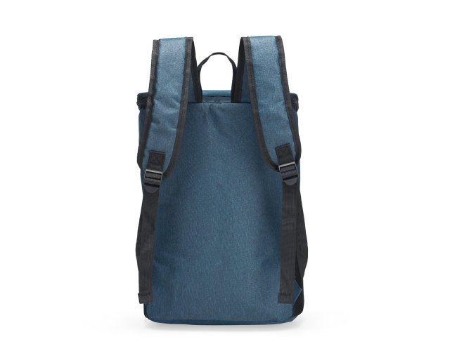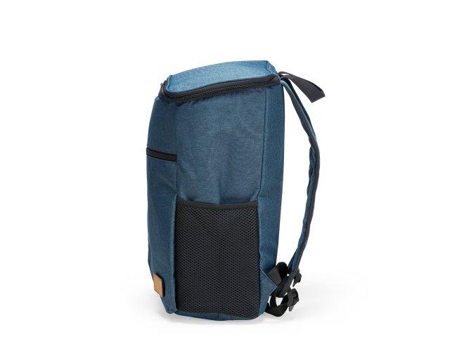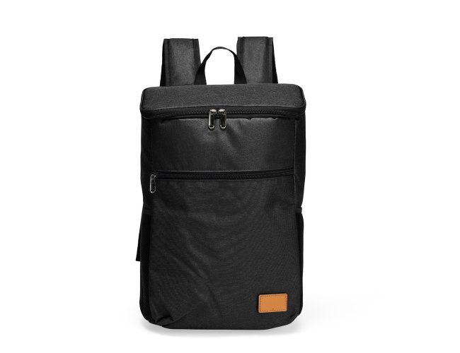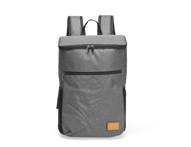 Descrição: Mochila térmica confeccionada em poliéster catiônico 300D resistente à água e capacidade máxima para até 18 litros. Possui revestimento térmico antivazamento em PEVA atóxico no compartimento principal, além de um bolso frontal com fechamento em zíper, dois bolsos laterais em espuma com elástico, duas alças para as costas e uma alça de mão em nylon. Acompanha plaquinha em couro sintético fixada com velcro.
