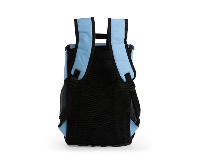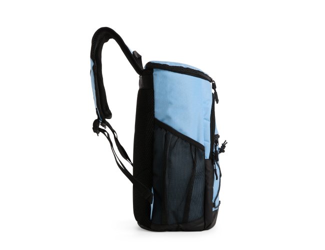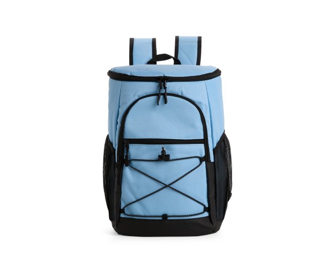 Mochila térmica confeccionada em poliéster impermeável com detalhes em couro sintético e capacidade máxima de 13 litros, distribuída em dois compartimentos revestidos em PEVA: um interno antivazamento e outro, menor, localizado na parte externa. Possui ainda três bolsos externos, incluindo dois em tela de nylon com elástico e um com fechamento em zíper e cordão de elástico ajustável, além de alças e painel traseiro revestidos em espuma respirável.
