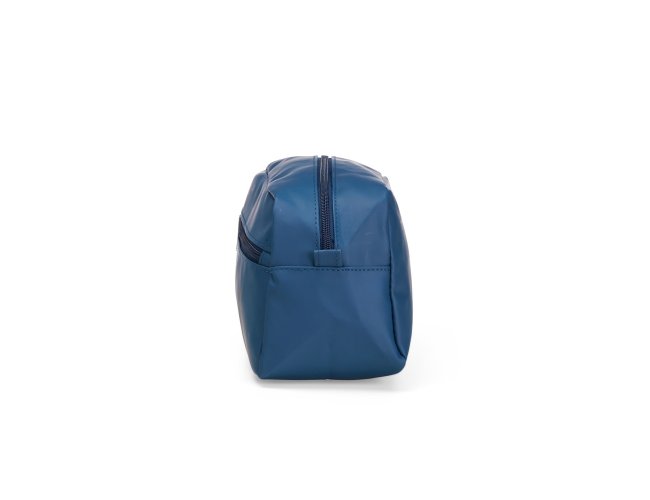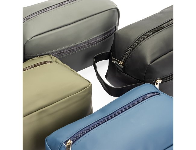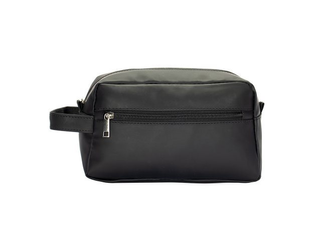 Nécessaire confeccionado em couro sintético impermeável. Possui compartimento principal com fechamento em zíper, além de um bolso frontal externo, alça de mão e duas alças menores para fixação de chaveiro ou gancho.