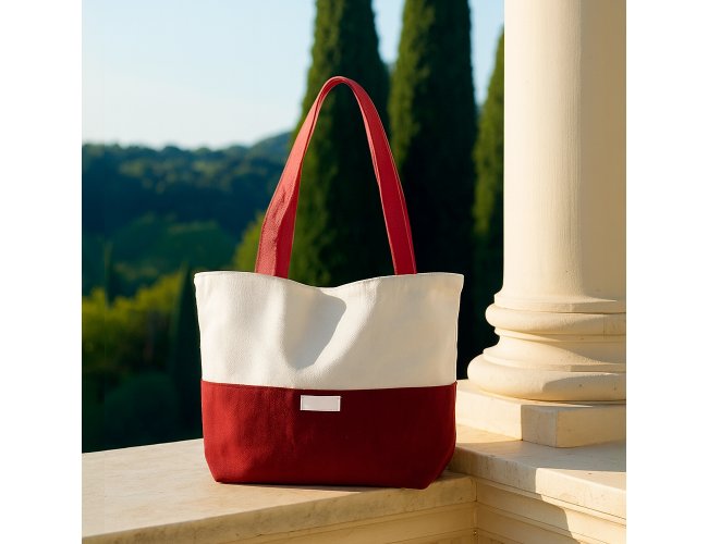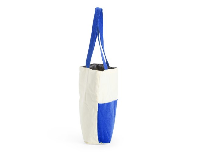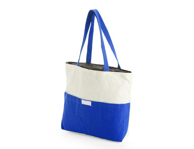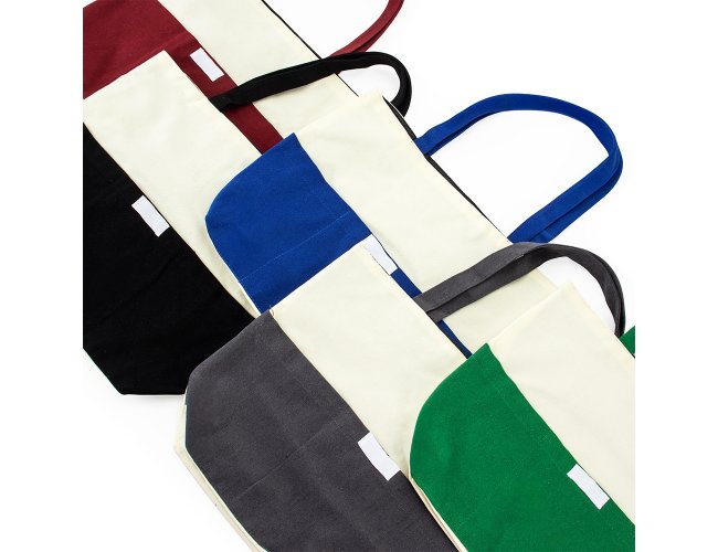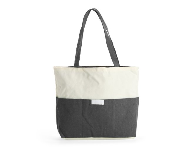 Sacola confeccionada em lona 356g/m² com revestimento interno em poliéster, bolso frontal aberto e duas alças com costura interna.