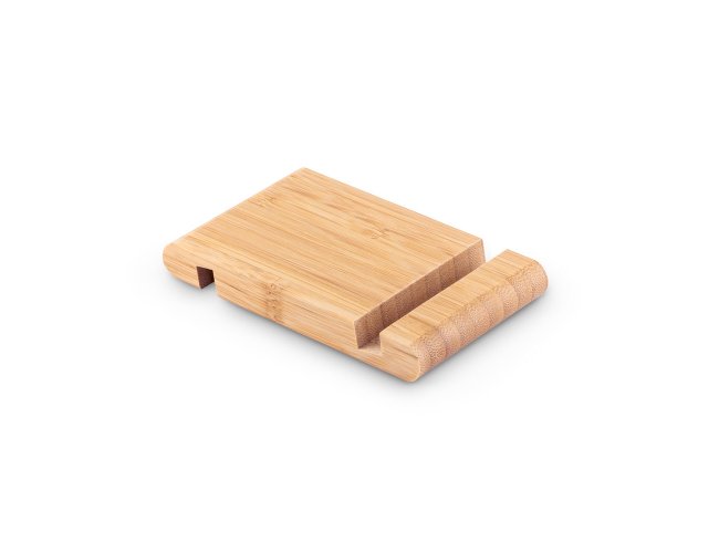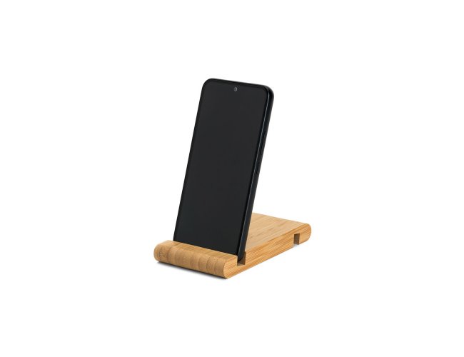 Suporte para celular em bambu, com 2 canaletas de tamanhos diferentes, uma em cada lado.